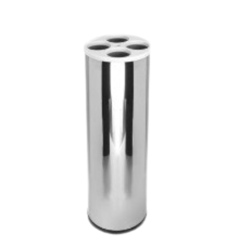 Confeccionado em aço inoxidável AISI 430, com fundo em plástico ABS e tampa injetada em plástico polipropileno (PP), possui tubo interno extrusado em plástico poliestireno (PSAI) para copos de água (180/200mL), 1 (um) para copos de café (50mL) e 1 (um) para descarte de palhetas usadas.